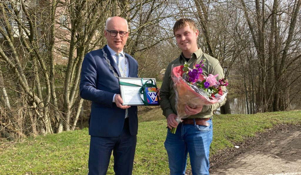Auke Tuinstra uit Drachten vond eerder al het eerste kievitsei van Friesland in Nijehaske. Op 5 maart kreeg hij de oorkonde in handen.