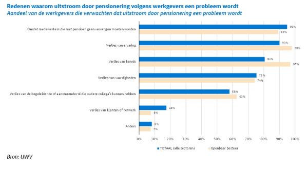 | Veel werkgevers verwachten problemen door pensionering werknemers Eén van de uitdagingen voor de arbeidsmarkt is de toenemende uitstroom van werknemers door pensionering. Hierdoor houden de personeelstekorten langer aan. Daarom vroeg UWV 3.500 werkgevers naar hun verwachtingen over (de gevolgen van) pensionering. Bijna vier op de tien werkgevers verwacht dat personeel de komende vijf jaar met pensioen gaat. Het percentage valt lager uit doordat veel werkgevers die meededen aan het onderzoek weinig werknemers hebben en dus ook minder vaak werknemers die de komende jaren met pensioen gaan. Van de werkgevers die met uitstroom door pensionering te maken krijgen denkt 45% dat dit een probleem wordt voor de organisatie. Openbaar bestuur nog meer last van pensionering In het openbaar bestuur hebben werkgevers nog vaker te maken met pensionering: 89% verwacht uitstroom doordat medewerkers met pensioen gaan en 67% van hen denkt dat dit een probleem wordt. Die problemen komen volgens de werkgevers vooral door verlies van ervaring en verlies van kennis. In het openbaar bestuur is maar liefst één op de zeven werknemers in Friesland 60 jaar of ouder. Daarmee is het openbaar bestuur – op de transportsector en de industrie na – de meest vergrijsde sector. |
