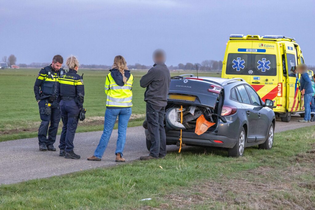 Een ambulance en de politie zijn met spoed ter plaatse gekomen ter hulpverlening aan de bestuurder. De man is behandeld door het ambulancepersoneel en daarna met zijn ouders mee gegaan naar huis. Tevens is de scooter meegenomen in de auto.